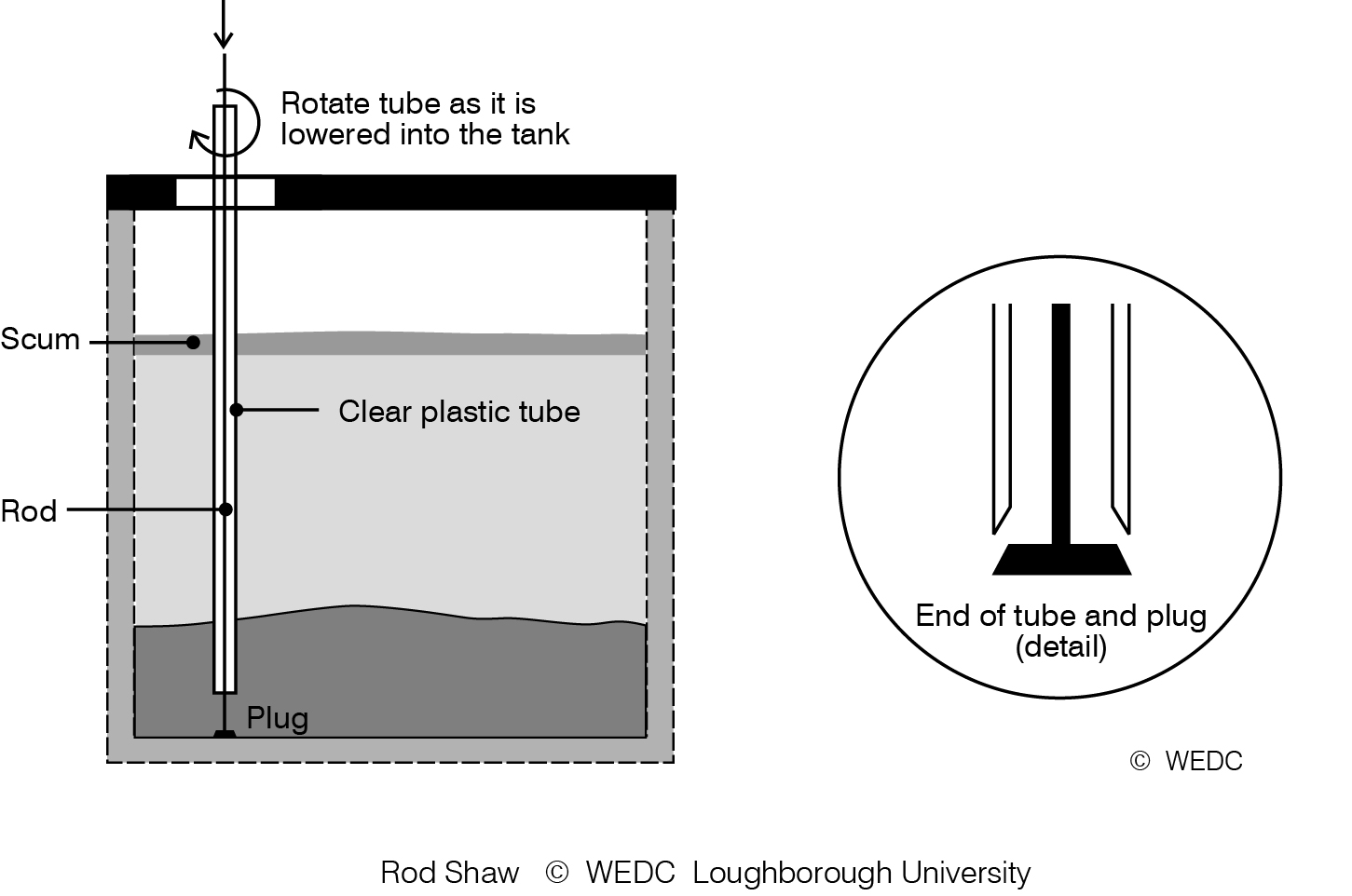 Measuring the thickness of sludge and scum | Mozambique slab - plan and cross-section | Options for flow through tank partitions | ||